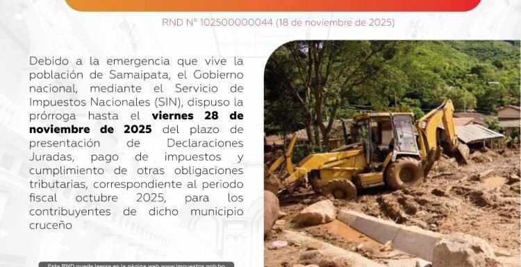 La Paz, 19 de noviembre de 2025.- Debido a la emergencia que vive la población de Samaipata, el Gobierno nacional, mediante el Servicio de Impuestos Nacionales (SIN), dispuso la prórroga hasta el 28 de noviembre de 2025 del plazo de presentación de Declaraciones Juradas, pago de impuestos y cumplimiento de otras obligaciones tributarias, correspondiente al periodo […]